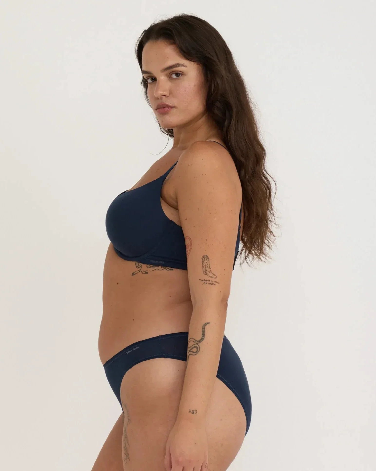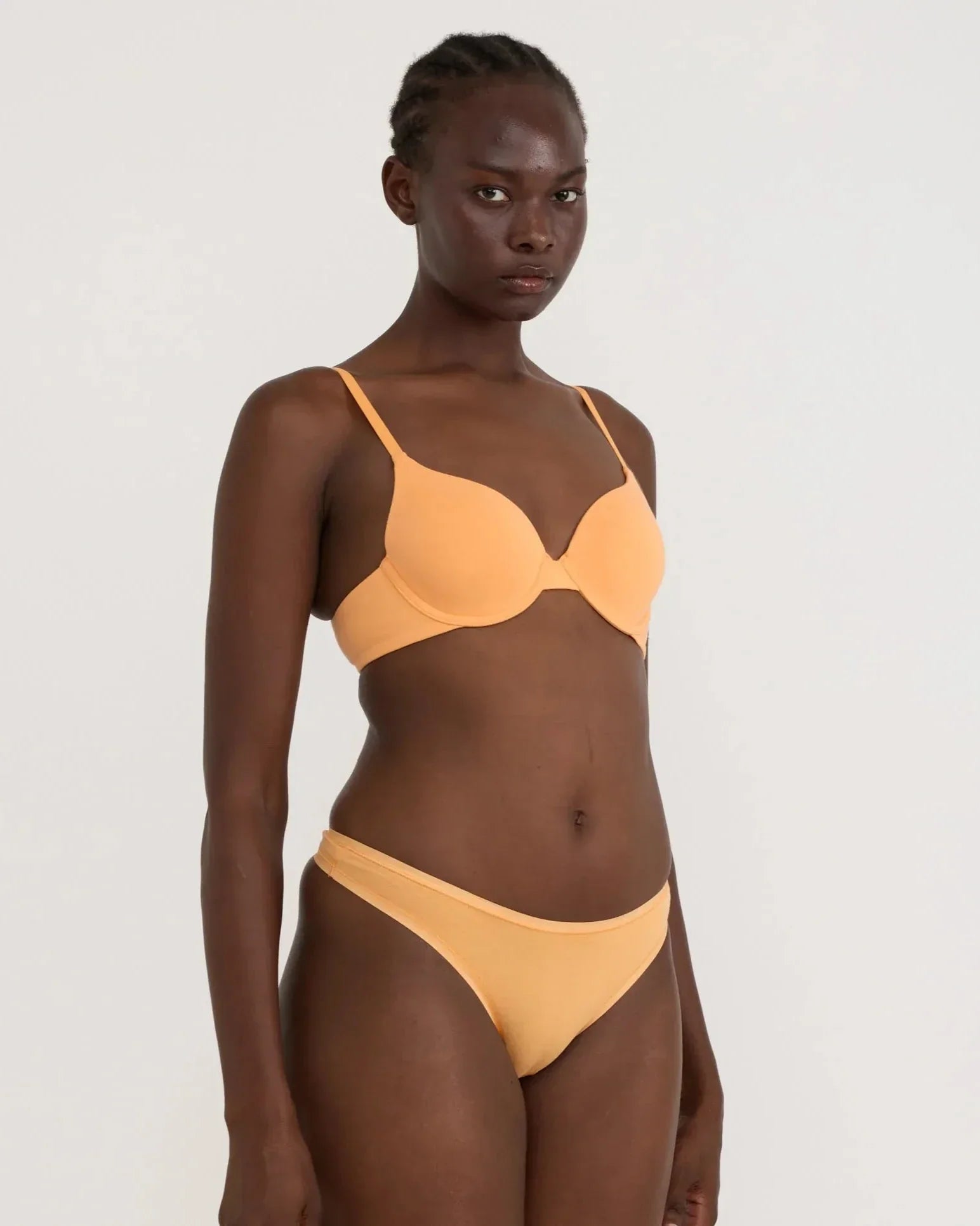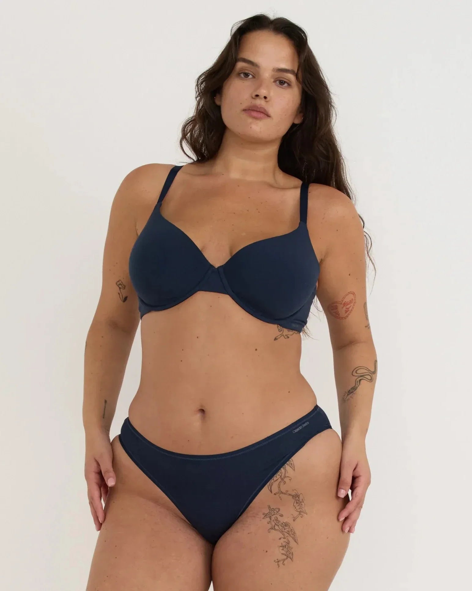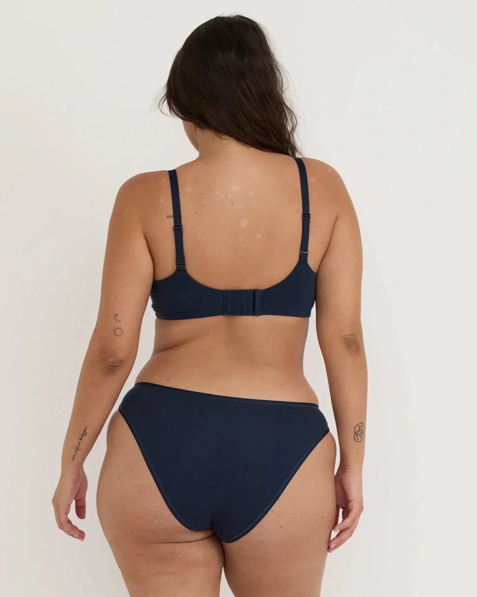 The search for a sustainable bra is over. This classic, full coverage t-shirt bra is made for ultimate comfort and support, while still having a smooth look and feel under clothing. Made with buttery-soft organic cotton, this bra features adjustable straps that can be customized to be worn straight or crossed, and a hook-an-eye closure in the back.