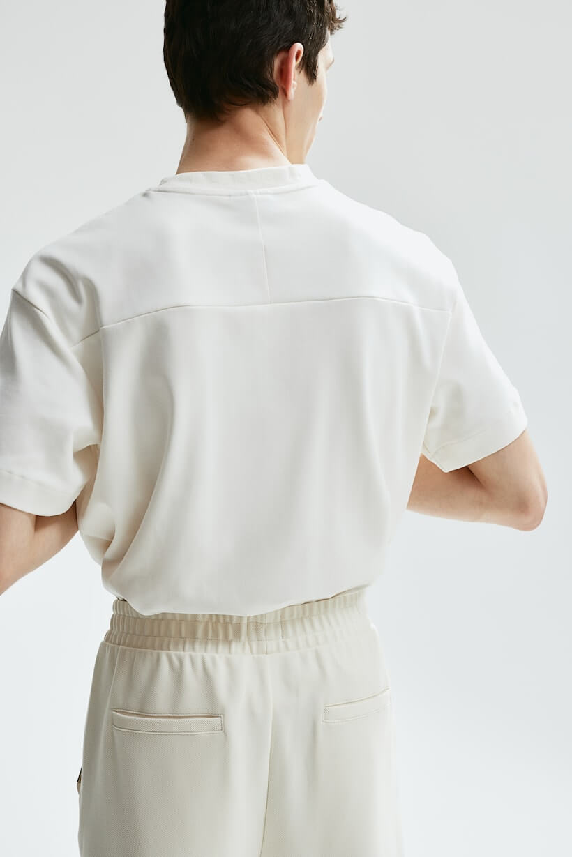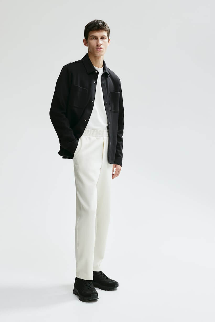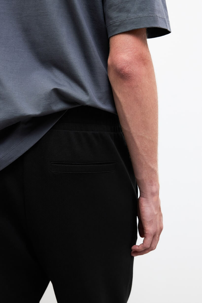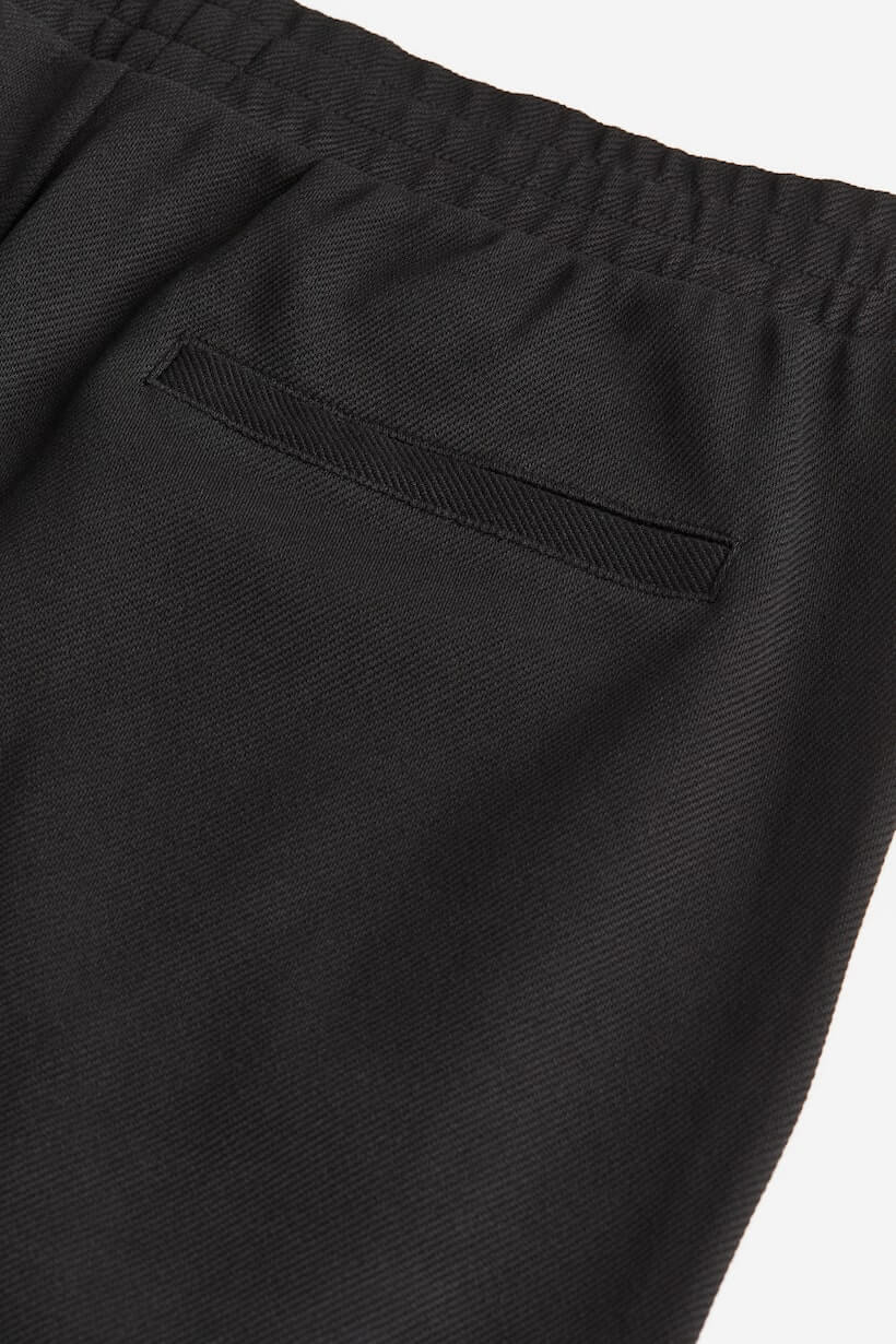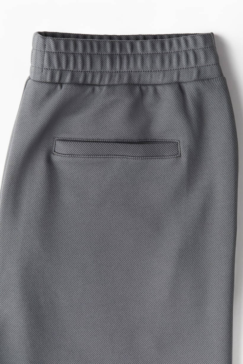 Slim-fit joggers in twill with a fitted silhouette. Covered elastic and a concealed drawstring at waistband, mock fly, diagonal side pockets, and welt back pockets.